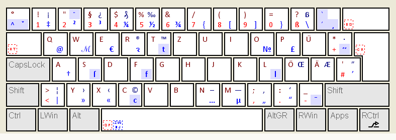 Die deutsche kbdgr und die schweizer kbdsg Tastatur, erweitert für das Schreiben in Frakturschrift.