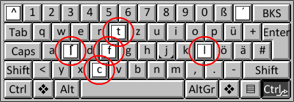 Rechte Strg schaltet t, f, c, langes s und l dauerhaft als Wartetaste (Deadkey) aktiv.